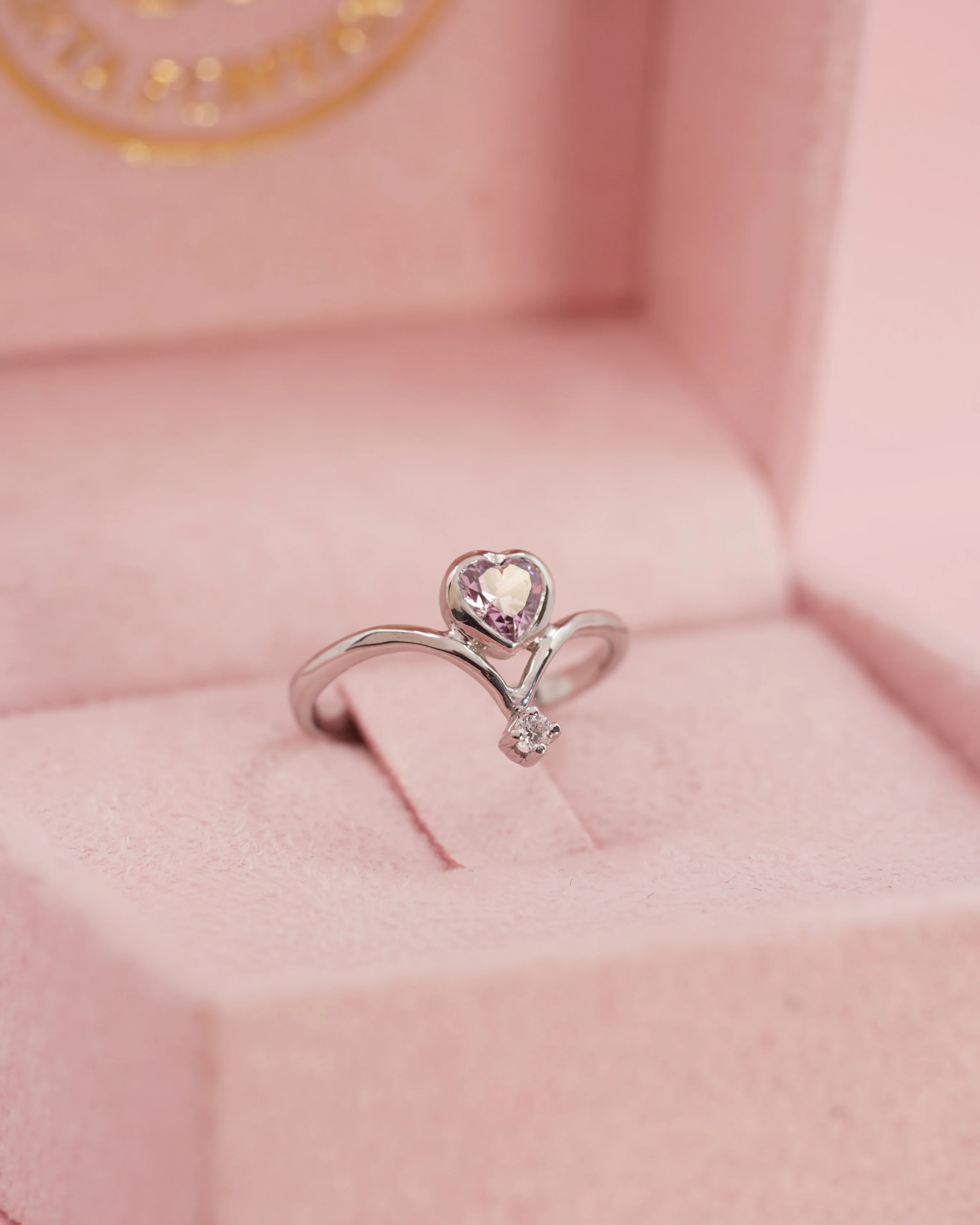 • Main gemstone: Pink heart-shaped zirconia (light pink or lavender)